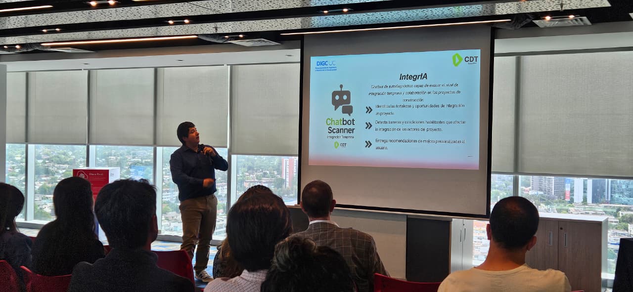 Uno de los hitos más relevantes de la jornada fue la presentación de IntegrIA, el nuevo chatbot de autodiagnóstico desarrollado por la CDT para medir el nivel de integración temprana en proyectos de construcción.