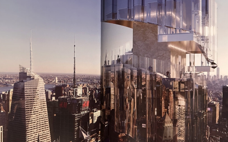 Ubicado en 740 Eighth Avenue, el edificio se distingue por su corona en espiral que funcionará como mirador y sede de una inusual atracción: Un paseo de caída libre a más de 300 pies de altura.