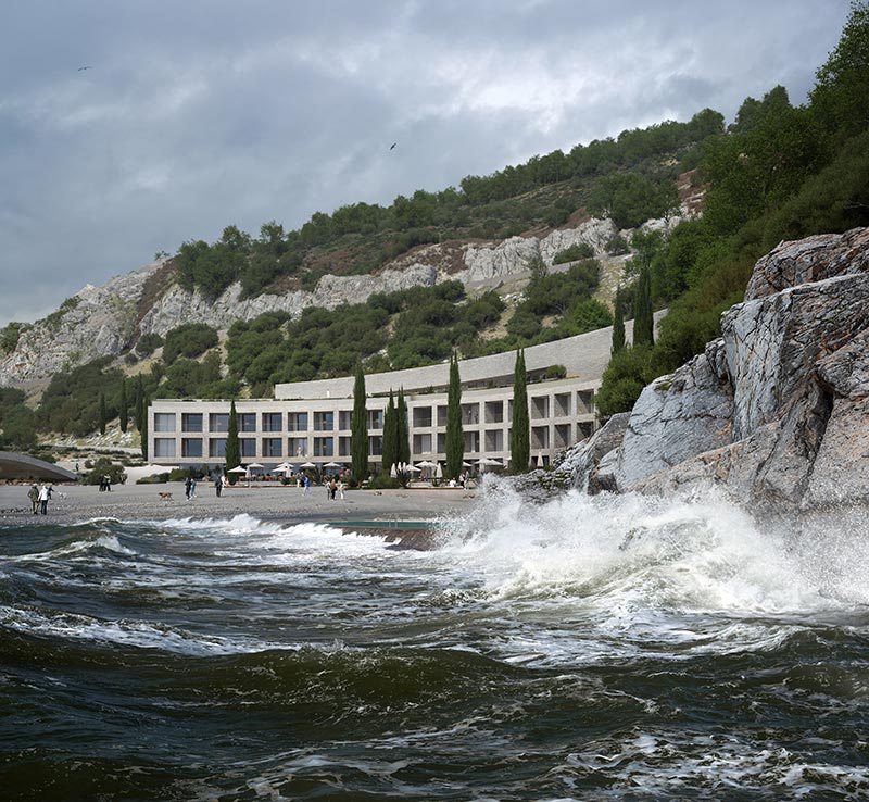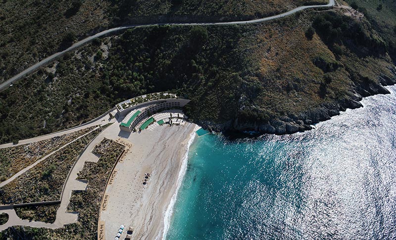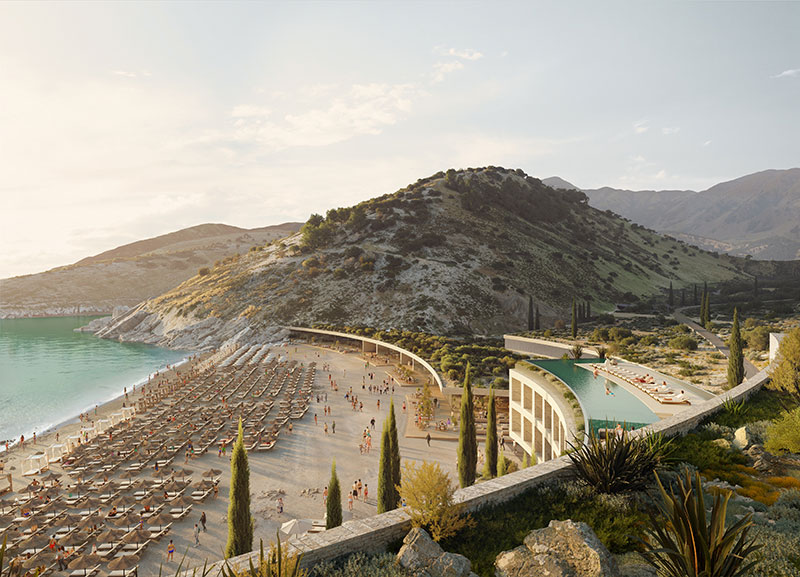 Integrado en la escarpada costa de la Riviera albanesa, The Concave es un hotel boutique de lujo que se fusiona con los contornos naturales de la playa de Llamani. Ubicado en un superficie de 56,000 m², la construcción abarca 10,835 m² y cuenta con 63 habitaciones, un centro de bienestar de 460 m², piscinas cubiertas y al aire libre, áreas de ocio, restaurantes y bares, así como estacionamiento interior privado con espacios adicionales exteriores para acceder a la playa.